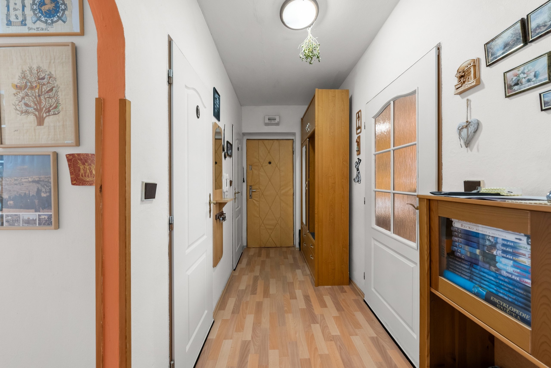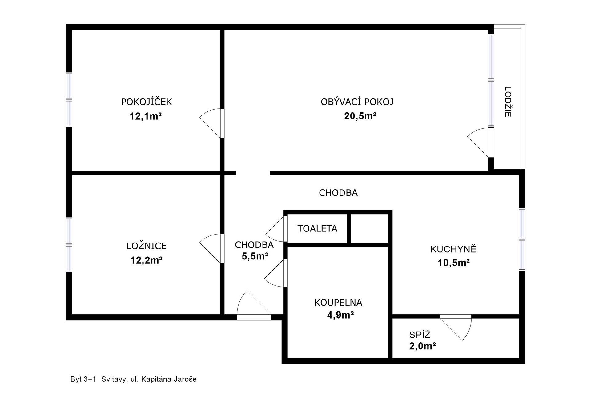 Obývací pokoj (20,5m2), pokojíček (12,1m2), ložnice (12,2m2), kuchyně (10,5m2), spíž (2,0 m2), koupelna s komorou (4,9m2), předsíň (5,5m2) a samostatné WC (1,0m2). Byt má lodžii (cca 2,4m2) a sklep (cca 6,8m2).