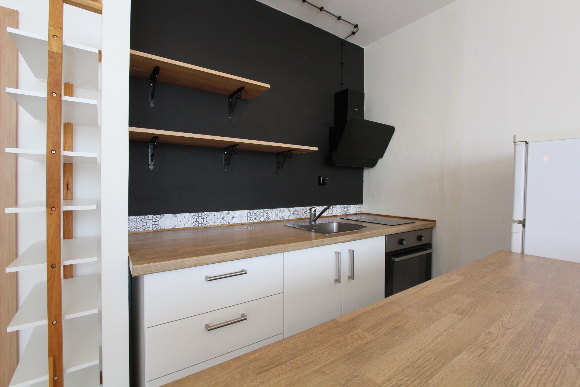 Kuchyňský kout je vybaven kuchyňskou linkou s indukční varnou deskou (2 plotýnky), vestavěnou elektrickou troubou, digestoří a lednicí s mrazákem.