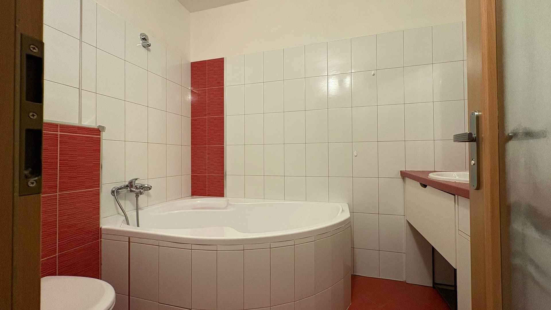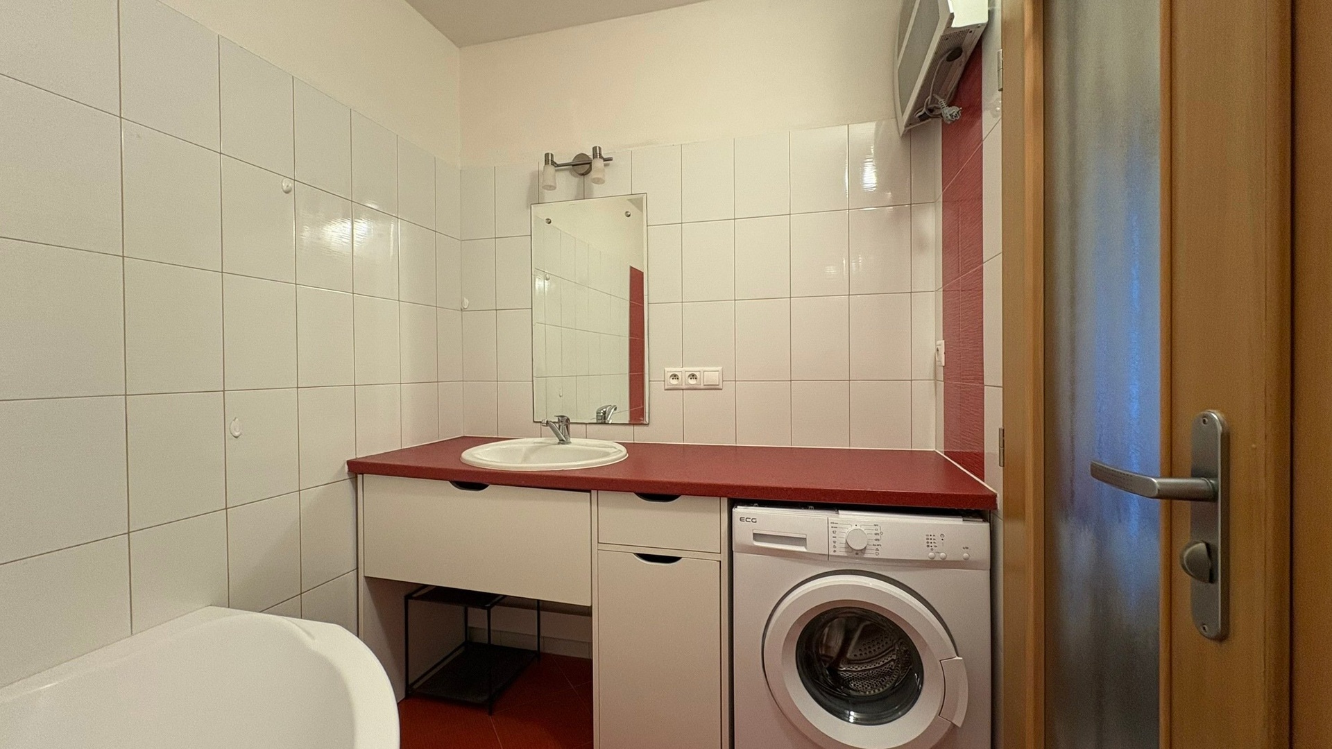 V koupelně je vana, umyvadlo, pračka a koupelnová skříňka.