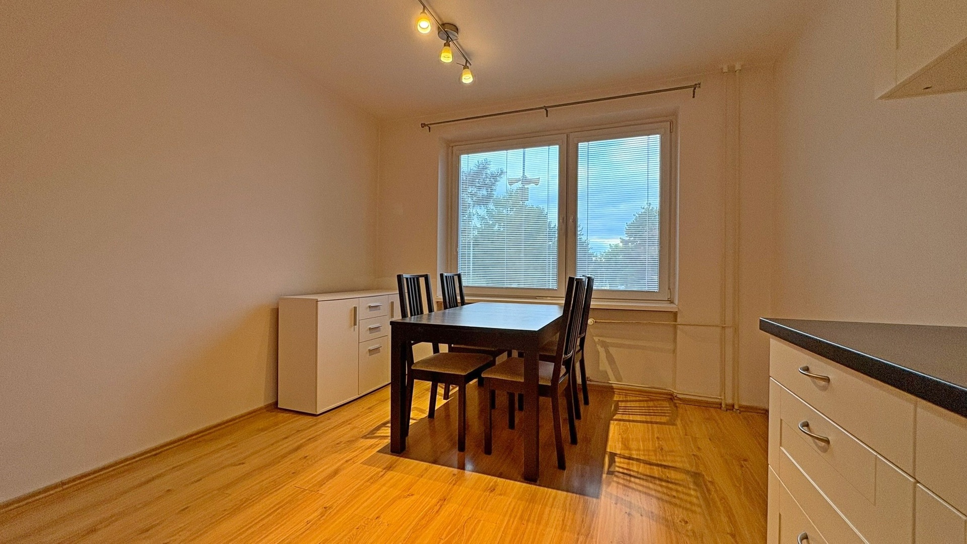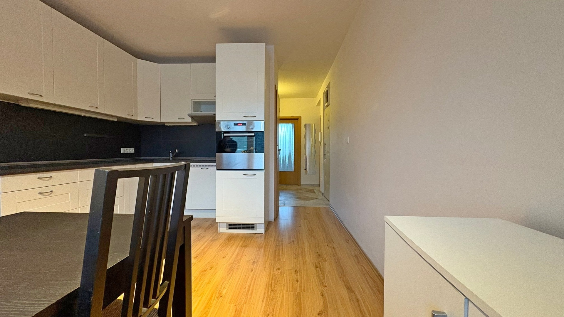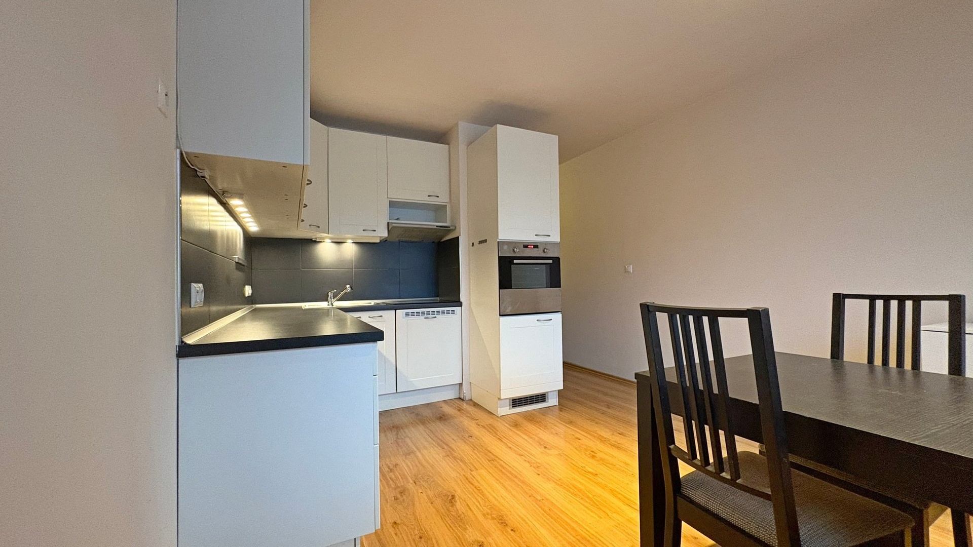 Kuchyňský kout je vybaven kuchyňskou linkou s vestavěnými spotřebiči – indukční varná deska, horkovzdušná trouba, digestoř a myčka.